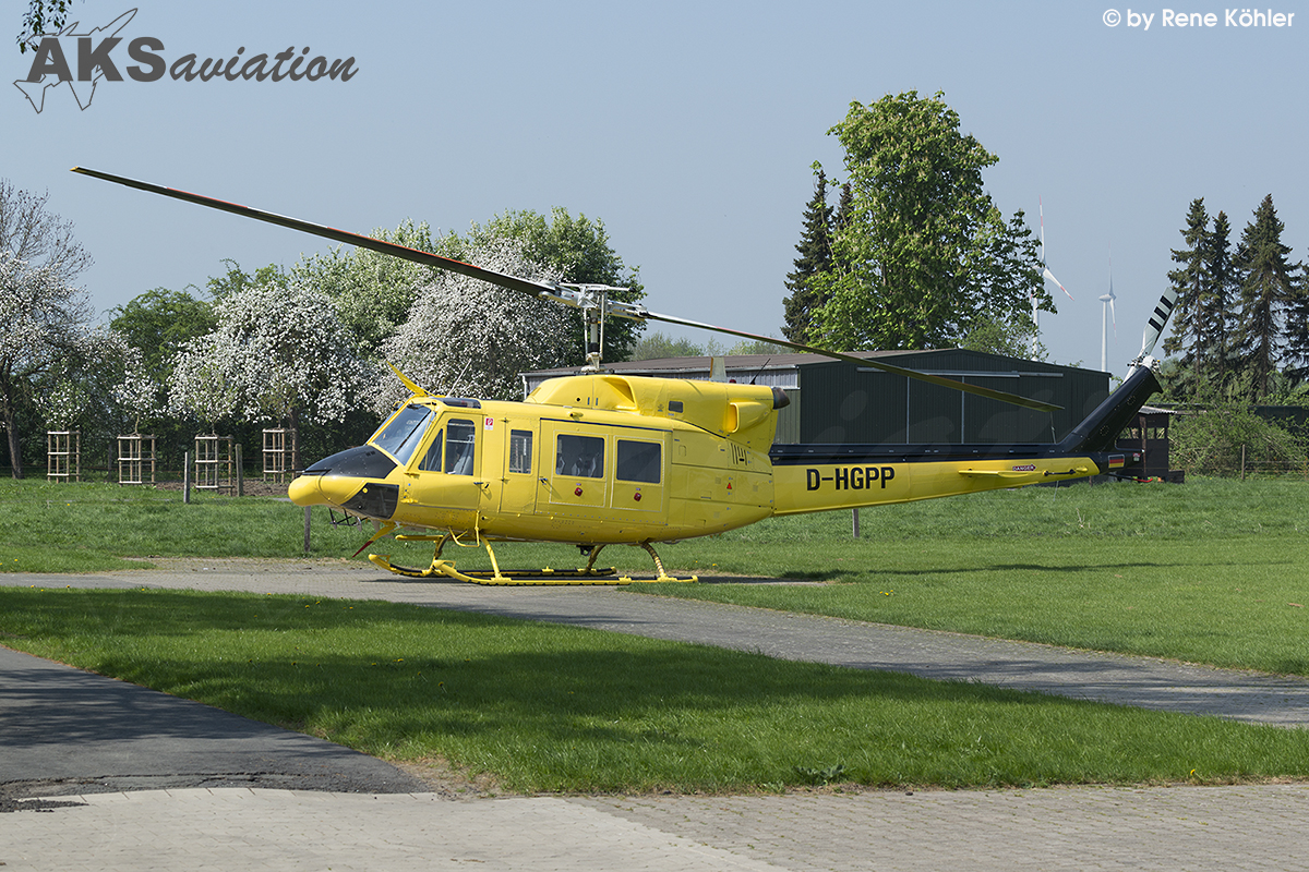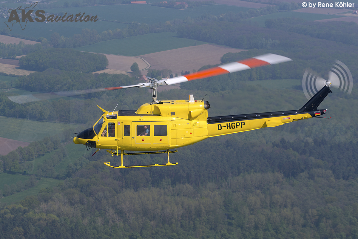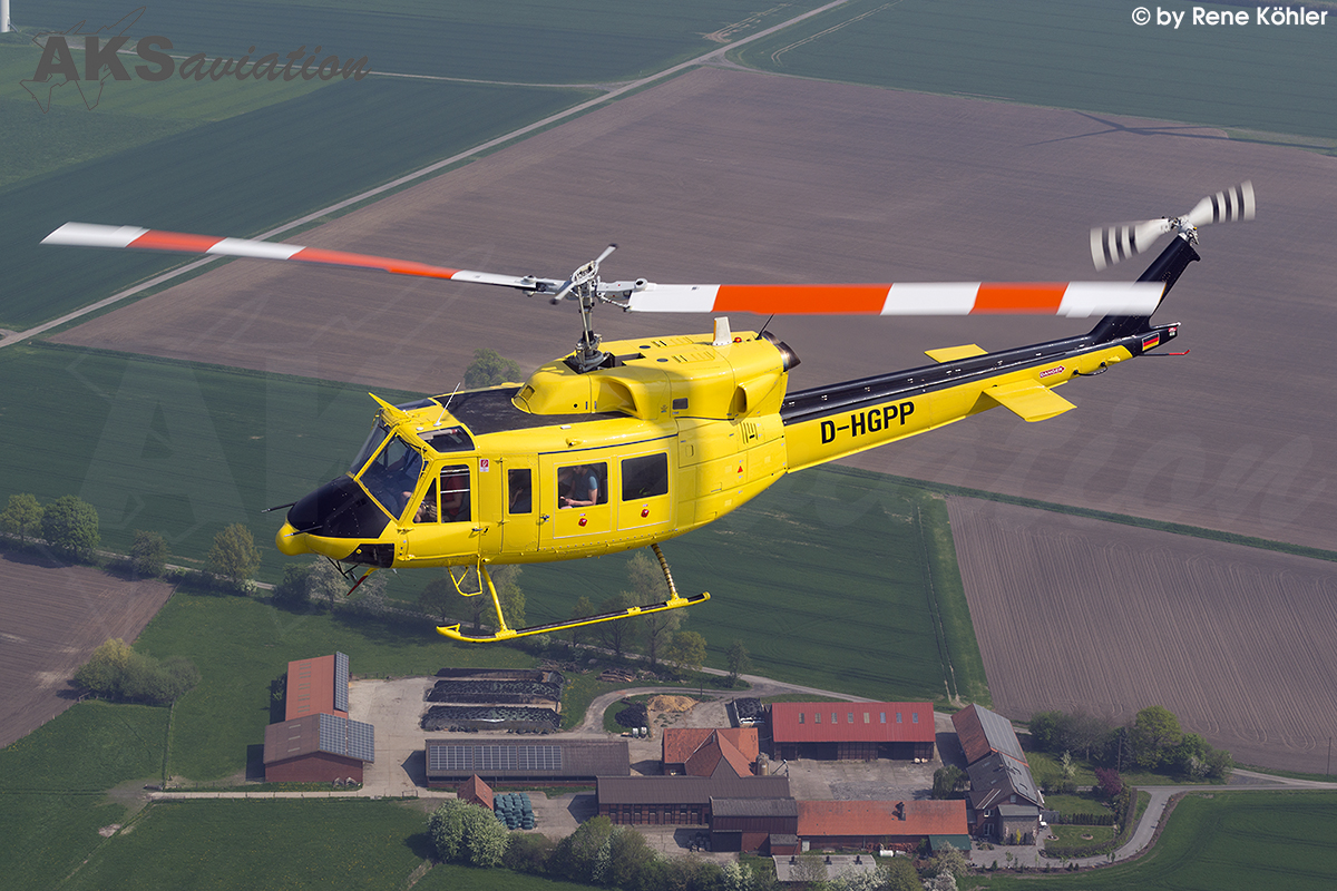 The company-owned runway of Agrarflug Helilift counts 700 meters and after an overshoot we landed finally. In front of the hangar the yellow Bell 212 was already ready for the next mission. Another Bell Jet Ranger was available for sightseeing flights over Ahlen. After we parked our Cessna we met the pilot of the Huey and finalized last details about our shooting. Back in the air we flew a quick circle over Ahlen and D-HGPP was already with us. We followed its north-western direction, took our photos and are satisfied with the results.