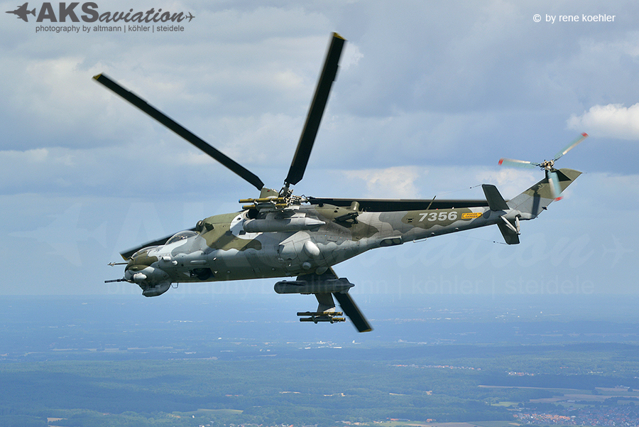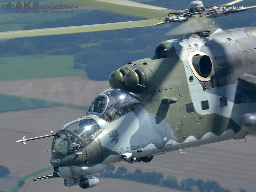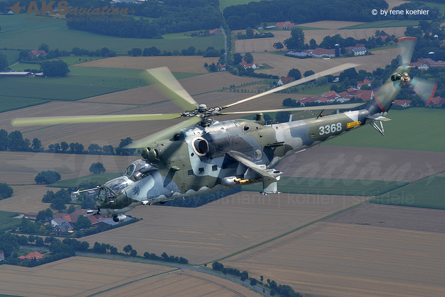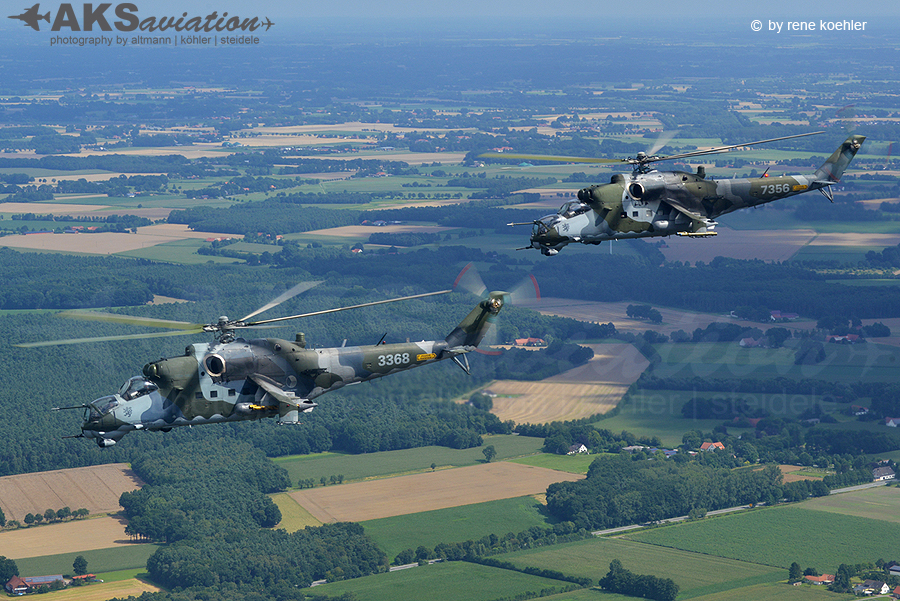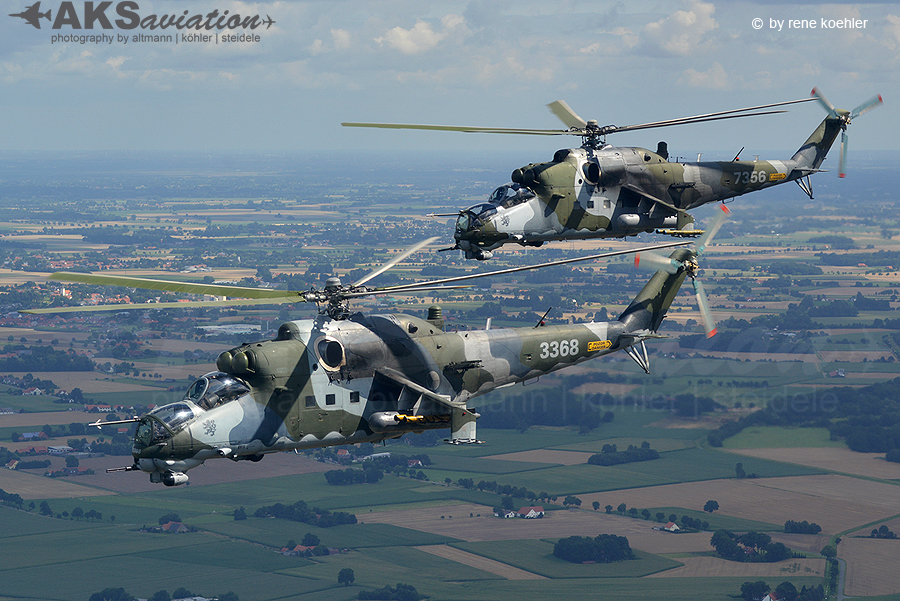 Zum einen ein Mil Mi-24V „Hind“, 3368 und ein Mil Mi-35 „Hind“. Beide Hubschrauber, aus russischer Produktion, sind im Osten Tschechiens beheimatet. Ihre Anreise aus Námest, vom 221.vrlt (221 Sqn), führte die beiden „Hind“ nach Bückeburg. Kurz nach dem Tankstopp trafen wir westlich vom Heeresflugplatz in Bückeburg auf die Tschechen.