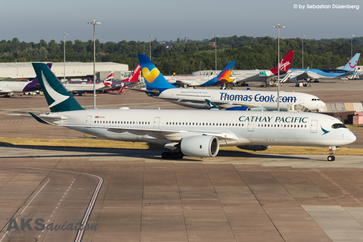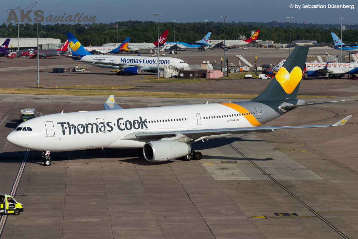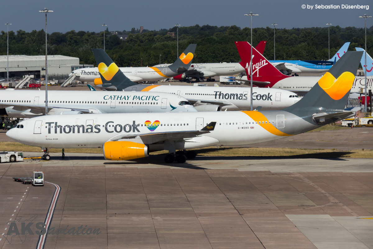 Gut einen Monat später war es dann soweit. Mit weiteren Spottern checkten wir am Flughafen Köln/Bonn für den Flug „FR1592“ ein, um nach einem ruhigen Flug gegen 10:00 Uhr Ortszeit in Manchester zu landen. Zunächst begaben wir uns auf das Parkhaus am Terminal 1, von dem man einen guten Blick auf viele Langstreckenflieger, wie beispielweise den A330 der Thomas Cook, der „Queen of the Skies“ der Virgin Atlantic, TUI Dreamliner, sowie die Airbus A350 von Singapore Airlines und Cathay Pacific hat. Die Position ist bis zum Mittag gut nutzbar und mit Hitzeflimmern hat man lediglich Probleme, wenn ein Flieger vor den APUs anderer Flugzeuge vorbei rollt.
