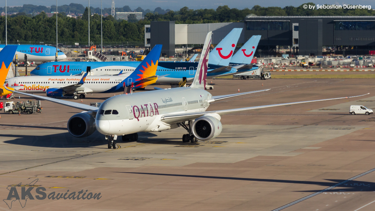 Nach gut einer Stunde wechselten wir auf eine Position in der Nähe des AirportInn-Hotels, auf der Südseite des Flughafens. Vom Hotel aus gelangt man auf einen Hügel, von wo man den Anflug der 05L, sowie die ausrollenden Maschinen der 05R, im Blick hat. Da das Hitzeflimmern jedoch an dieser Position extrem war, immerhin hatten wir Temperaturen um 27 Grad an dem Tag, entschieden wir uns nach etwa anderthalb Stunden eine Pause einzulegen und etwas essen zu gehen. Am Abend wechselten wir dann noch auf eine Position, von der aus man abfliegende Maschinen gut aufnehmen konnte. Diese befindet sich auf der nördlichen Seite des Flughafens am „Regus Manchester“. Am nächsten Morgen ging es dann gegen halb 7 erneut zum Parkhaus am Terminal 1, um dort noch einige Heavies abzulichten. Nach knapp anderthalb Stunden begaben wir uns dann jedoch schon in Richtung Abflughalle, da unser Flug um 08:55 Uhr Ortszeit zurück nach Köln ging. Alles in allem war es ein sehr gelungener Trip und sicherlich nicht der letzte Besuch in Manchester!